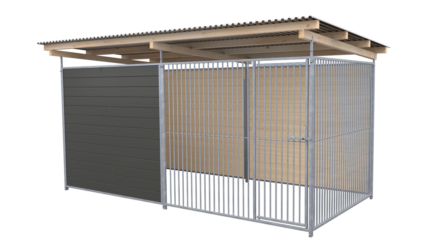 Eine ganze und eine halbe Wand sind bei dieser Zwingerlösung über Eck mit offenen Elementen im Rohrstabsystem versehen. Dabei kann je nach Bedarf, dank der flexiblen Systembauhttps://hunde-zwinger.de/cogi-glossary/hover/ca92f4a726724380acdc2a716ef3da08weise, die geschlossene Seitenwand links oder rechts angebracht werden.
