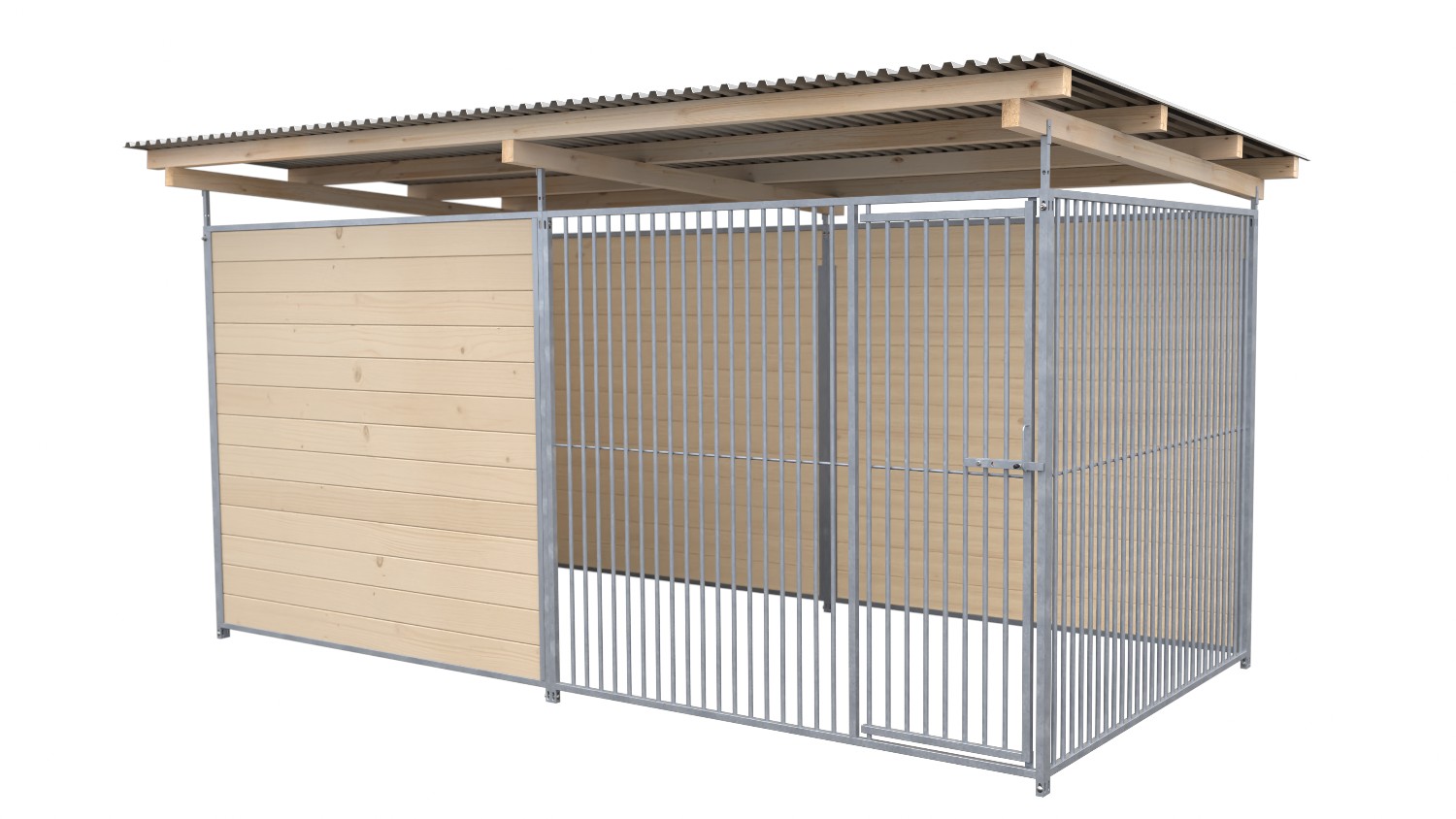 Eine ganze und eine halbe Wand sind bei dieser Zwingerlösung über Eck mit offenen Elementen im Rohrstabsystem versehen. Dabei kann je nach Bedarf, dank der flexiblen Systembauhttps://hunde-zwinger.de/cogi-glossary/hover/ca92f4a726724380acdc2a716ef3da08weise, die geschlossene Seitenwand links oder rechts angebracht werden.