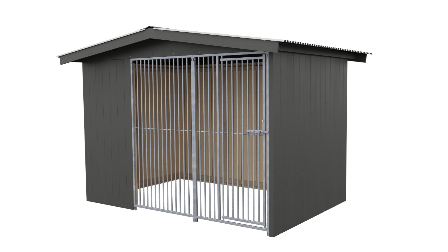Hundezwinger (Bausatz) aus Holz mit Giebeldach. Geschlossene Wände aus 20mm Massivholz, außen Graphitgrau. Rohrstabelement mit Tür in der Front, Rohrabstand 5 cm. (Ohne Boden, Hütte und Futterset).