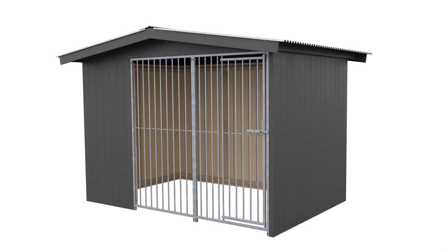 Hundezwinger (Bausatz) aus Holz mit Giebeldach. Geschlossene Wände aus 20mm Massivholz, außen Graphitgrau. Rohrstabelement mit Tür in der Front, Rohrabstand 8 cm. (Ohne Boden, Hütte und Futterset).