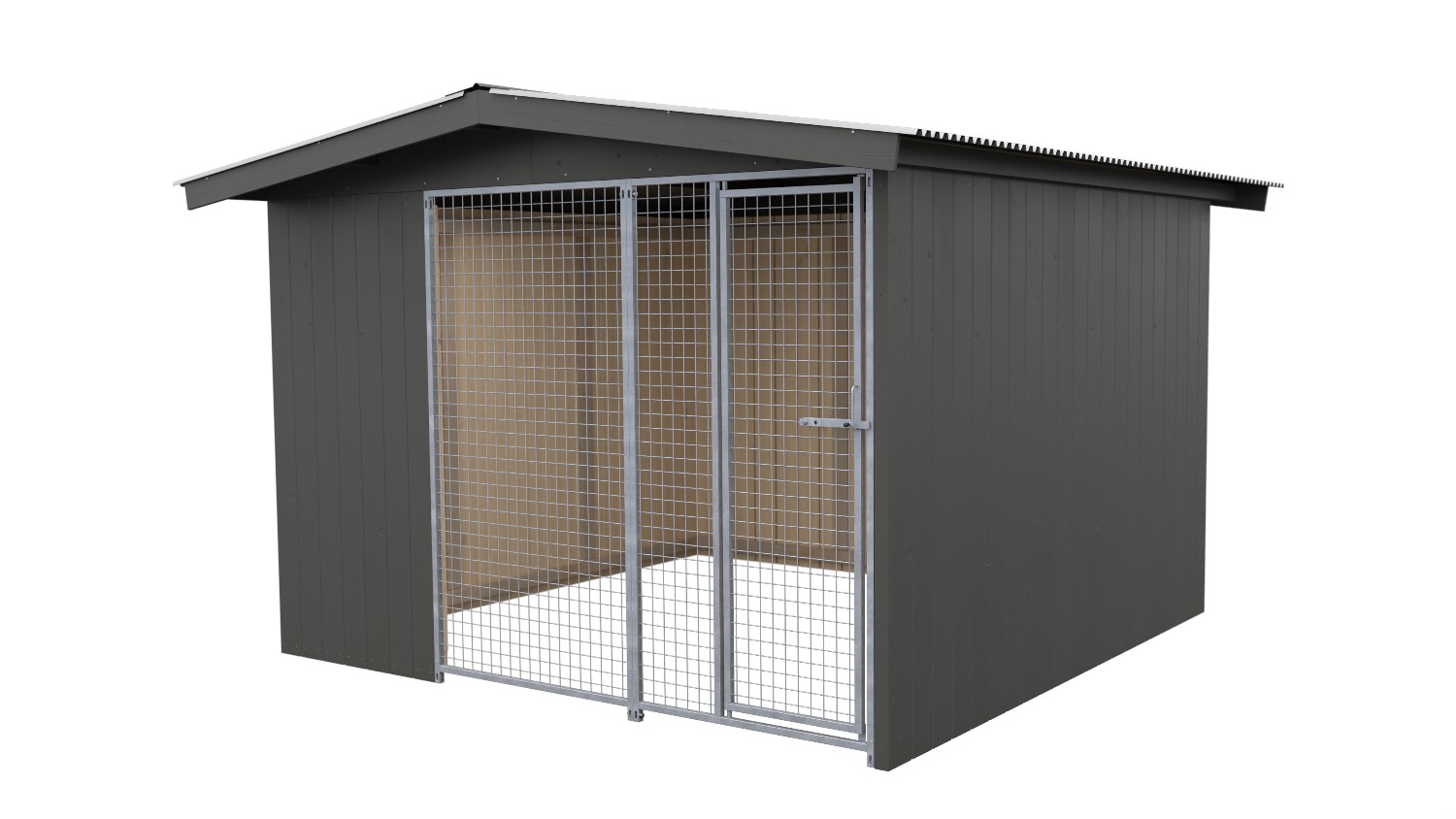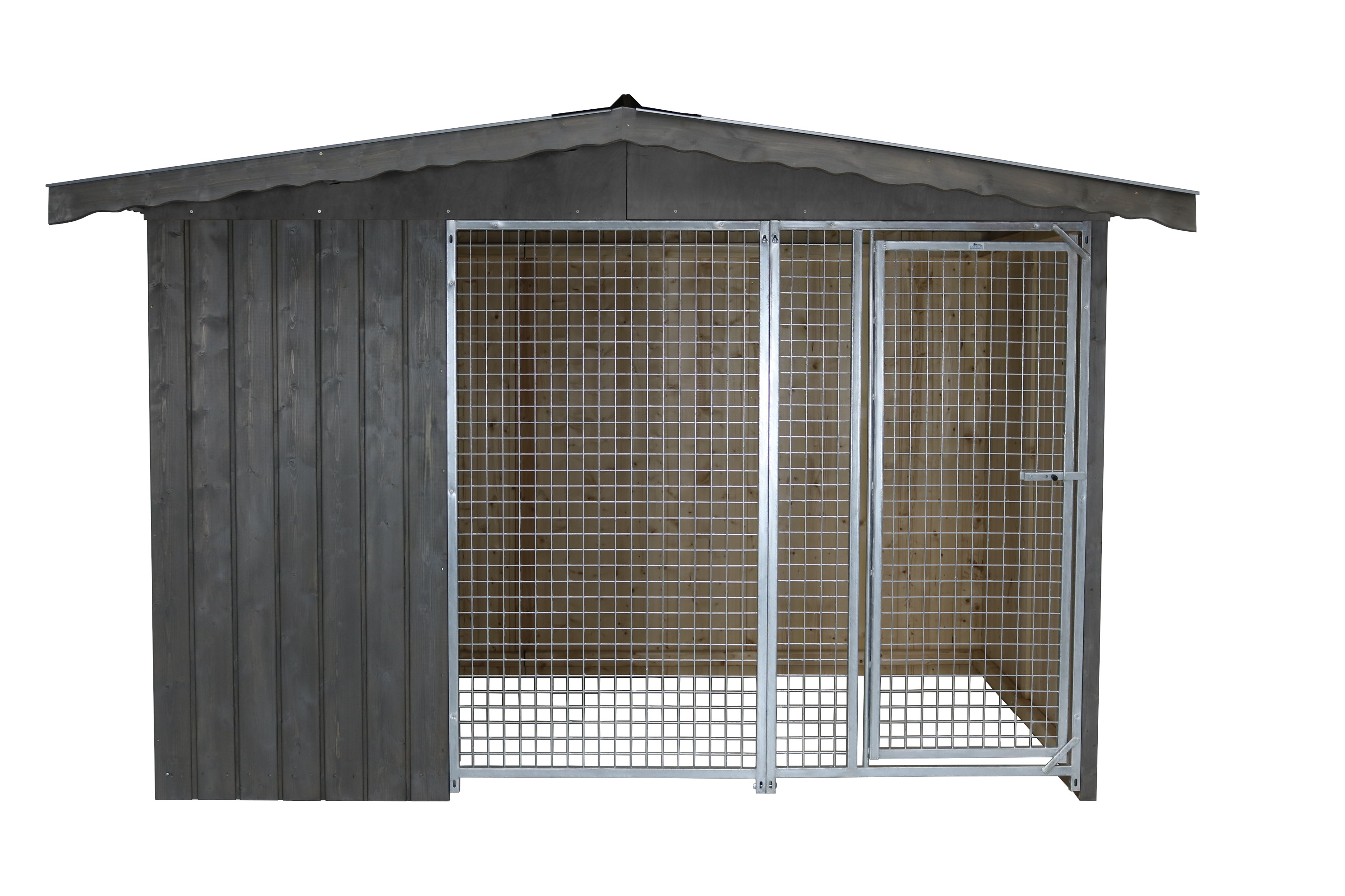Hundezwinger (Bausatz) aus Holz mit Giebeldach. Geschlossene Wände aus 20mm Massivholz, außen Graphitgrau. Gitterelement mit Tür in der Front, Maschenweite 5x5 cm. (Ohne Boden, Hütte und Futterset).