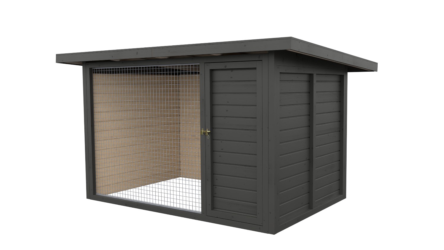 Exklusiver Zwinger aus Holz (Bausatz), mit Schrägdach, auf 3,5 Seiten geschlossen. Gitterelemente mit 4 mm Gitterstäben und einer Maschenweite von 5x5 cm in der Front.